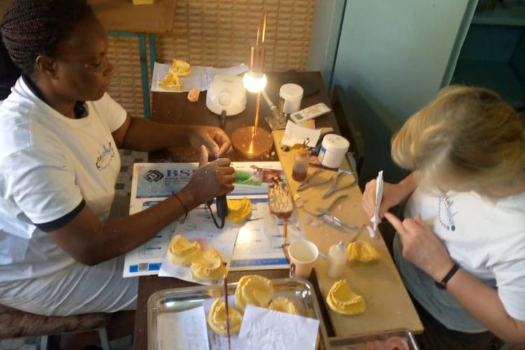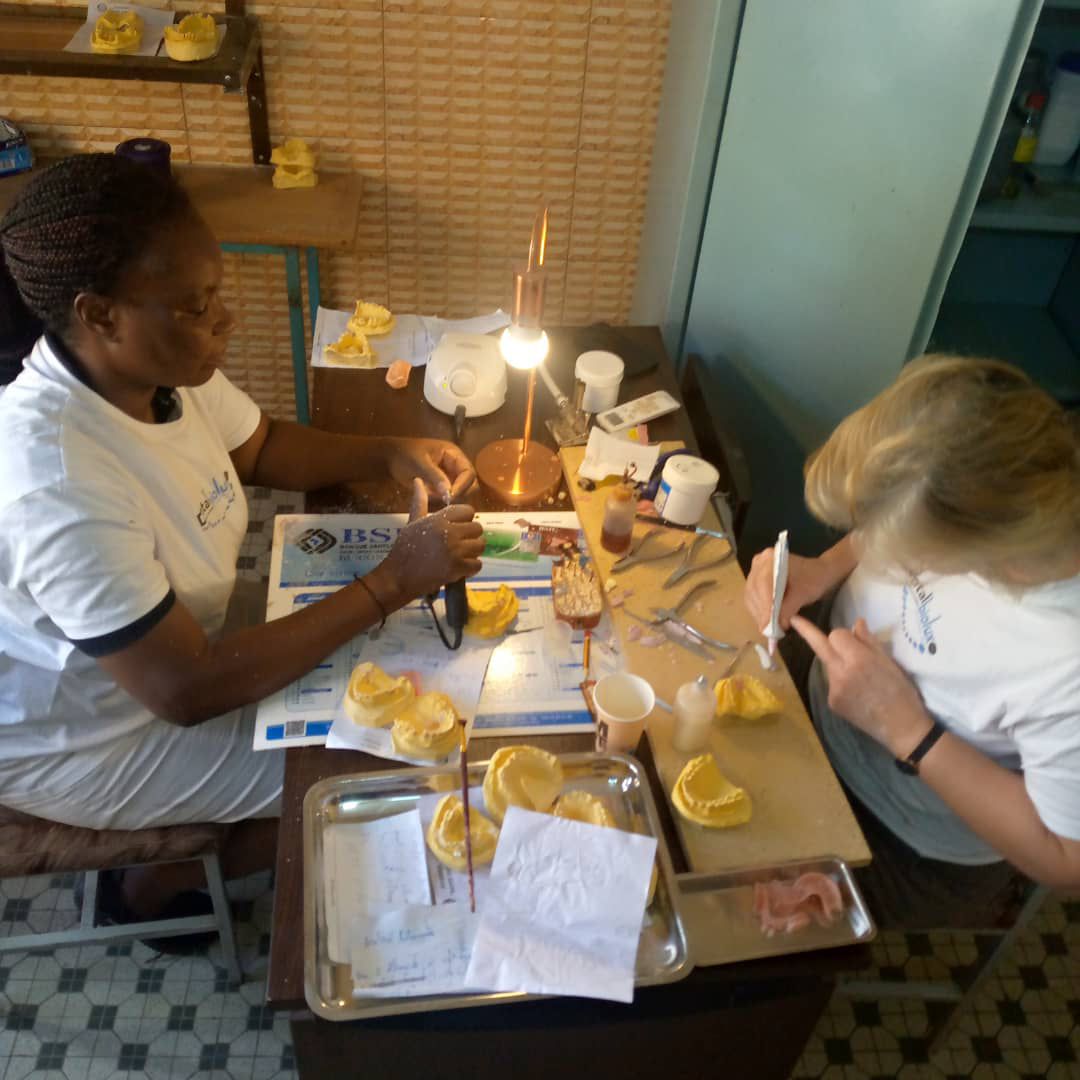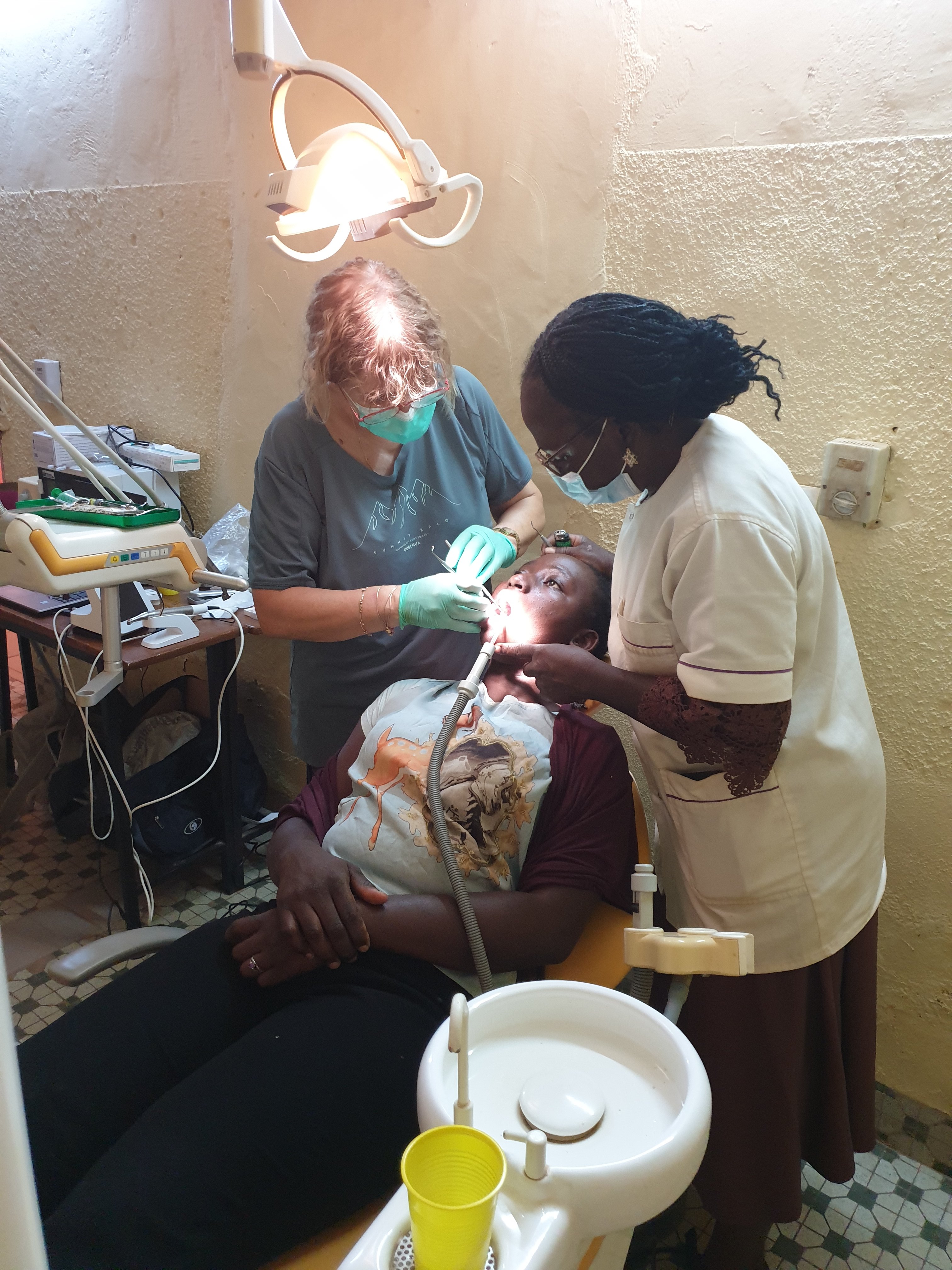 Certains viennent pour réaliser des prothèses dentaires. Vu l’état des routes et les bas côtés en terre surchargés de motos et vélos, les collisions sont fréquentes et les chutes provoquent des incisives cassées ou arrachées. La demande de remplacement est donc importante. Et, depuis plusieurs années, notre mission s’est enrichie de la collaboration d’une prothésiste belge, Ariane, qui forme une infirmière burkinabé. Ariane a généreusement amené tout le matériel nécessaire et de qualité depuis la Belgique pour ouvrir le premier laboratoire de prothèses dentaires. Grâce à cet apport, l’étudiante en prothèses réalise déjà des petites prothèses de une à six dents avec crochets. Elle est très douée et minutieuse.