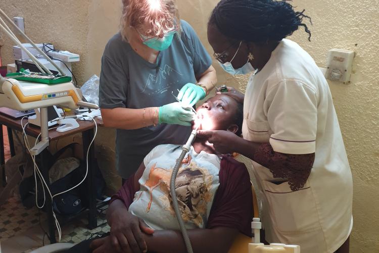 La mission de deux semaines en septembre 2025 s’est bien déroulée. Notre unité dentaire est incluse dans un grand institut d’enseignement pour infirmières et sages femmes. Depuis 4 ans, nous assurons la formation universitaire d’un étudiant burkinabé (déjà infirmier) à la profession de dentiste. Il lui reste juste 2 ans d’études pour obtenir son diplôme. Vu que les cours ne reprenaient qu’en octobre, cet étudiant, Didier, est venu faire son stage à Ouagadougou durant 2 semaines avec nous. Il est très motivé, très doué, comprend et apprend très vite les « trucs et ficelles » vu son bagage d’infirmier.
